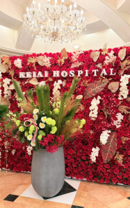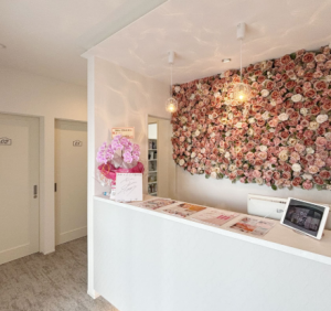 受付の壁面にフラワーウォールを採用